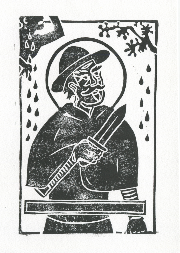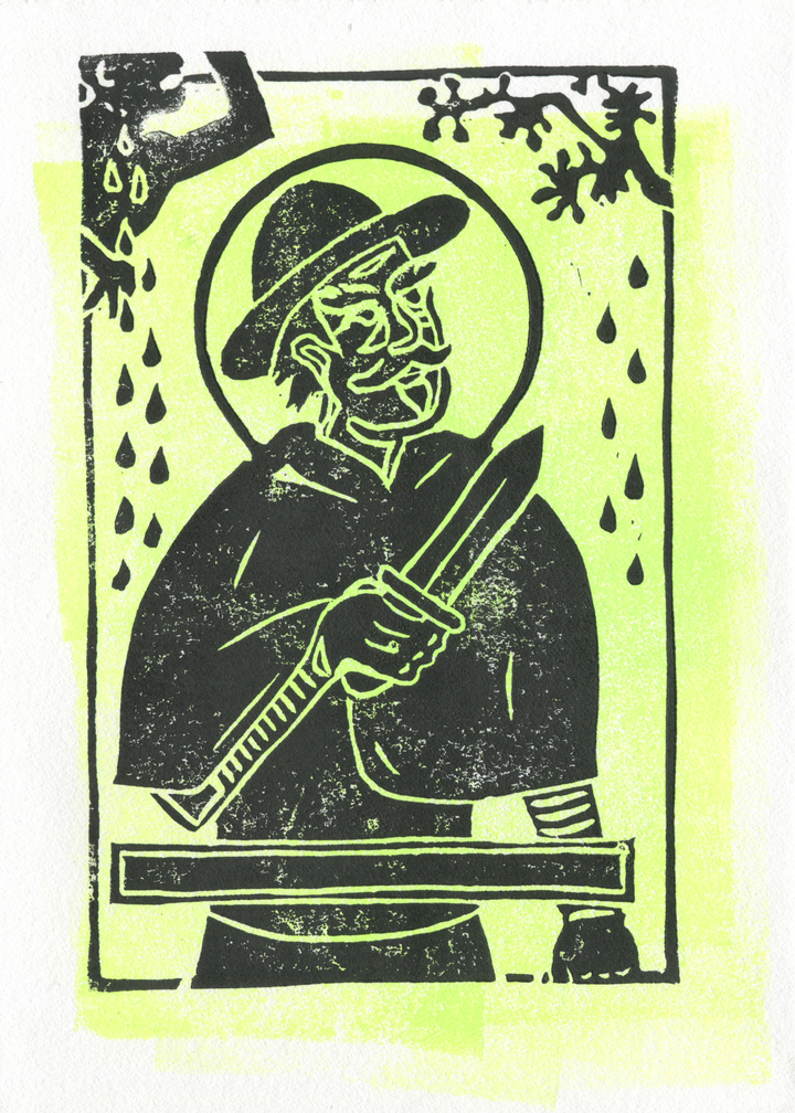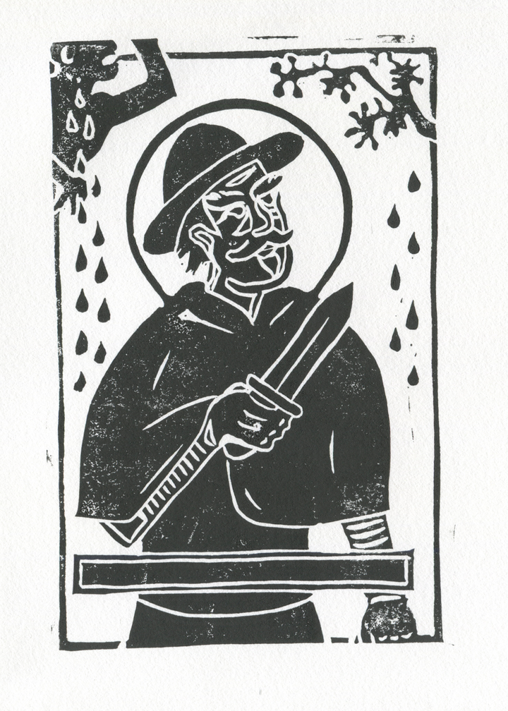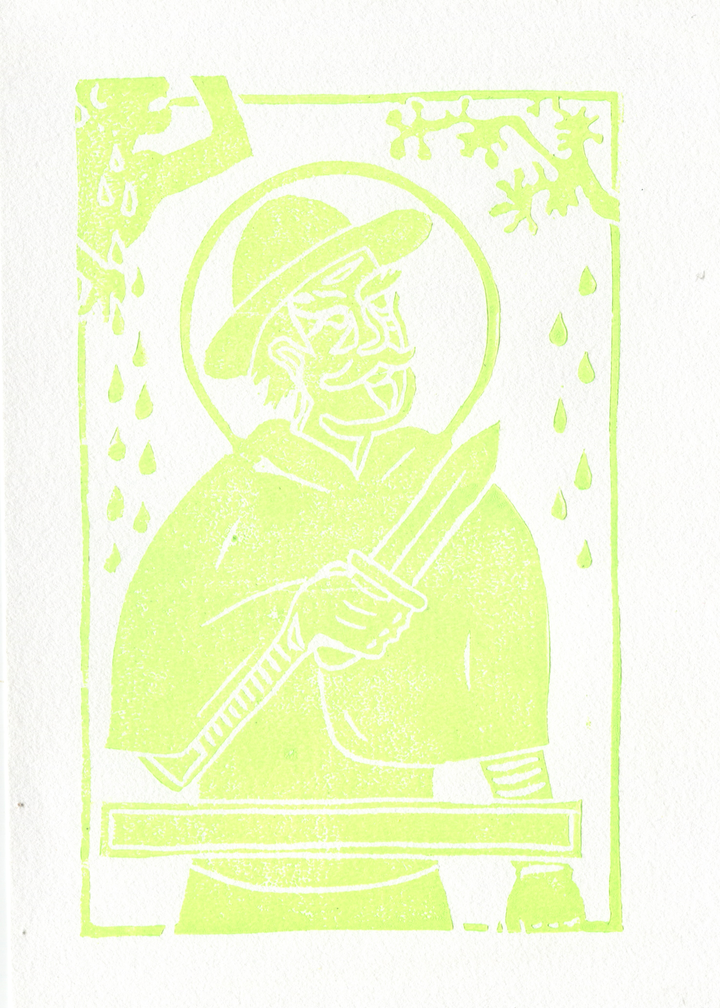 I wanted to make a Saint prayer card-style illustration of him, but also wanted to get out my linucut tools again.
